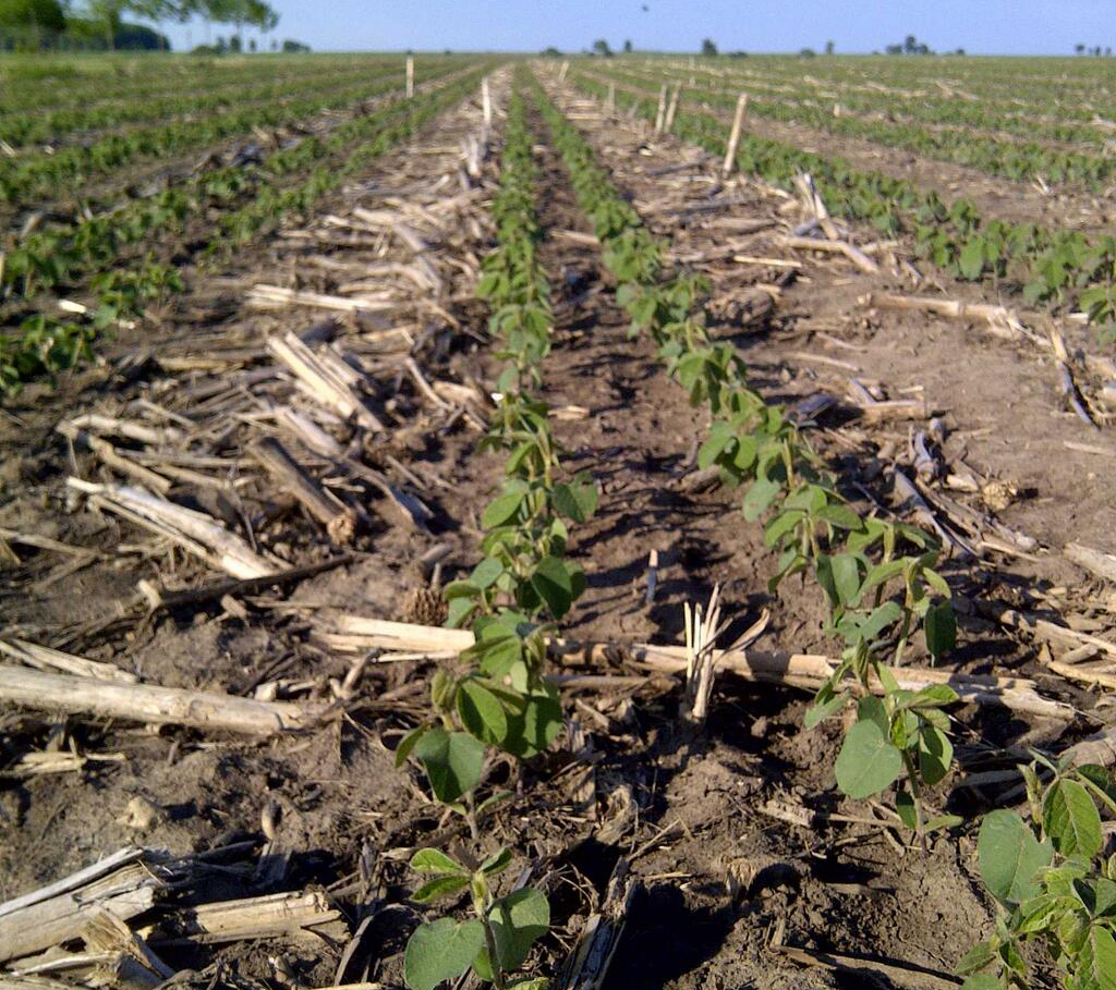 Figure 8. Corn planted into soybean residue after conservation (minimal) tillage (Credit: Paul Sullivan, P.T. Sullivan Agro Inc)