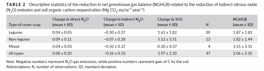 In every grouping in their summary table (legume cover crops, non-legume cover crops, mixed and total), the average change in SOC is less than the standard deviation. It’s essentially the same for total greenhouse gas emissions including nitrous oxide.